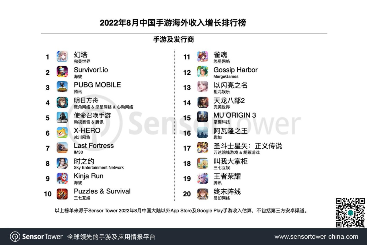 此外,祖龙娱乐(09990)《以闪亮之名》、完美世界《天龙八部2》港台版以及易幻网络《终末阵线》日文版(クァンタムマキ)等多款出海新游入围本期收入增长榜。