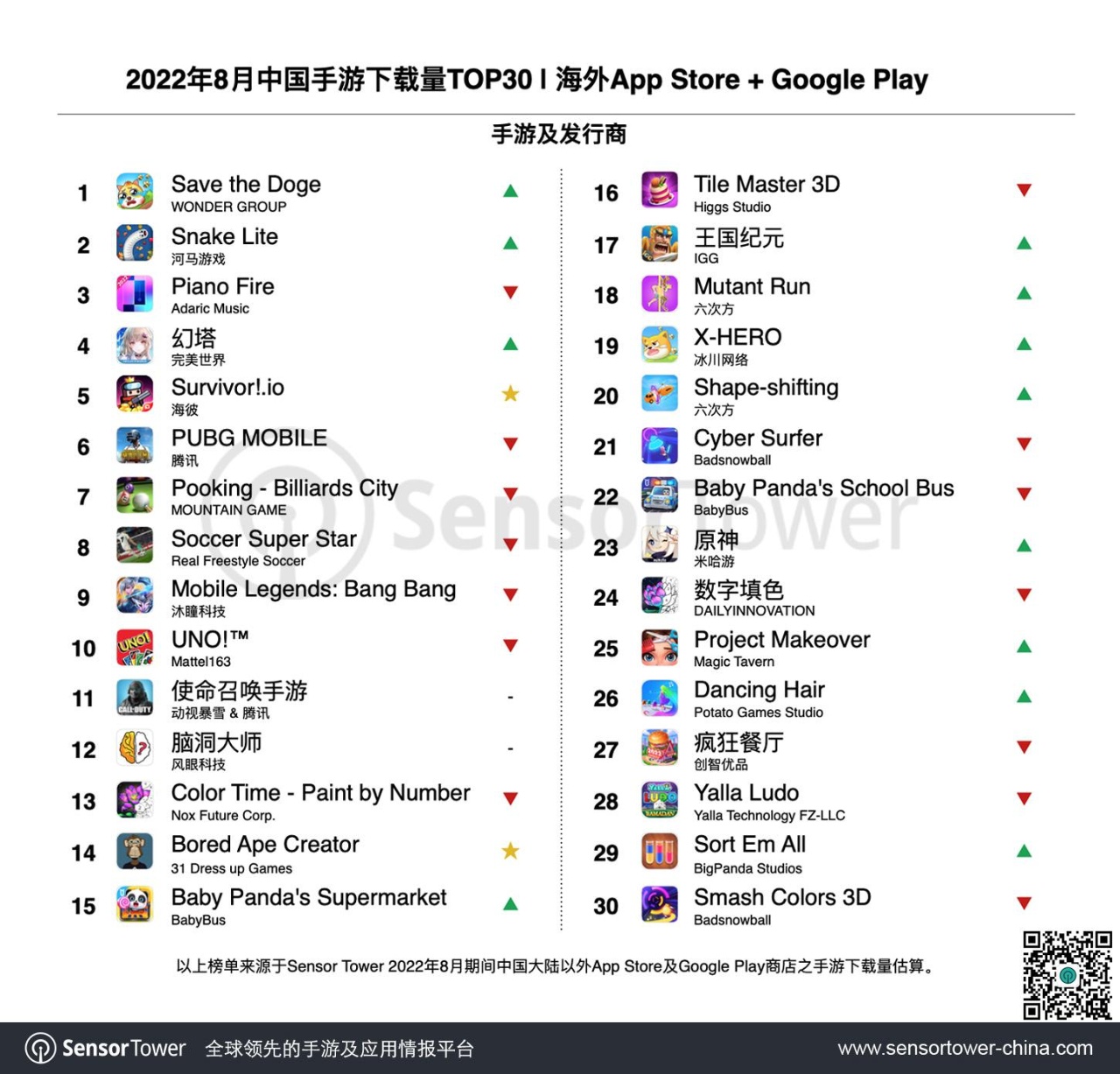 首次入围本期下载榜Top30的出海手游还包括31 Dress up Games《Bored Ape Creator - NFT Art》、六次方《Mutant Run》、冰川网络《X-HERO》、Potato Games Studio《Dancing Hair - Music Race 3D》以及BigPanda Studios《Sort Em All》。