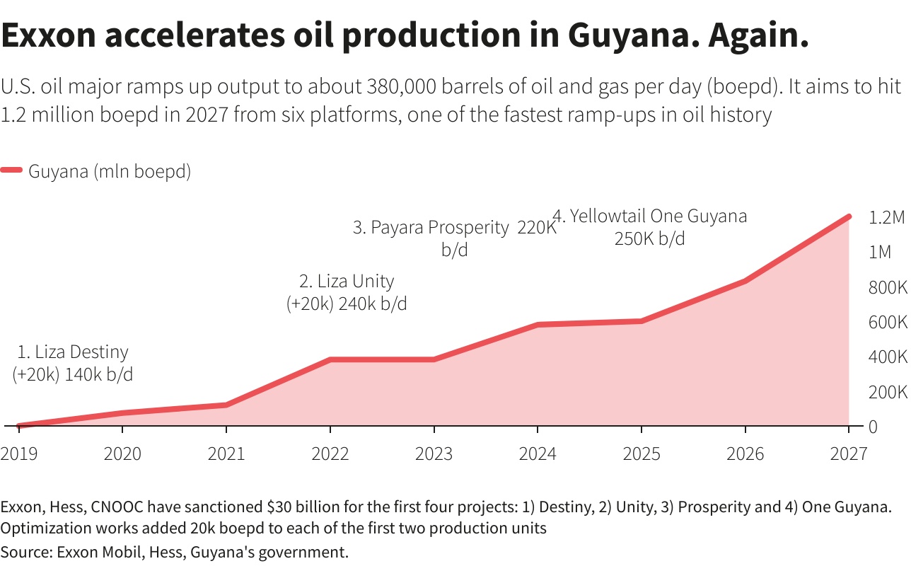 虽然圭亚那正在寻求稀释埃克森美孚在生产中的影响力,并希望获得更有利的合同条款,但圭亚那副总统Bharrat Jagdeo今年早些时候表示,如果埃克森美孚及其合作伙伴加快投资计划,圭亚那可能会考虑允许他们进入新区块。