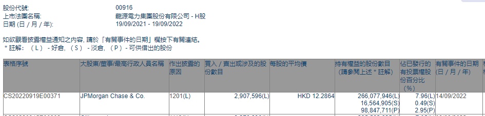 智通财经APP获悉,香港联交所最新资料显示,9月14日,小摩减持龙源电力(00916)290.7596万股,每股作价12.2864港元,总金额约为3572.39万港元。减持后最新持股数目约为2.661亿股,最新持股比例为7.96%。