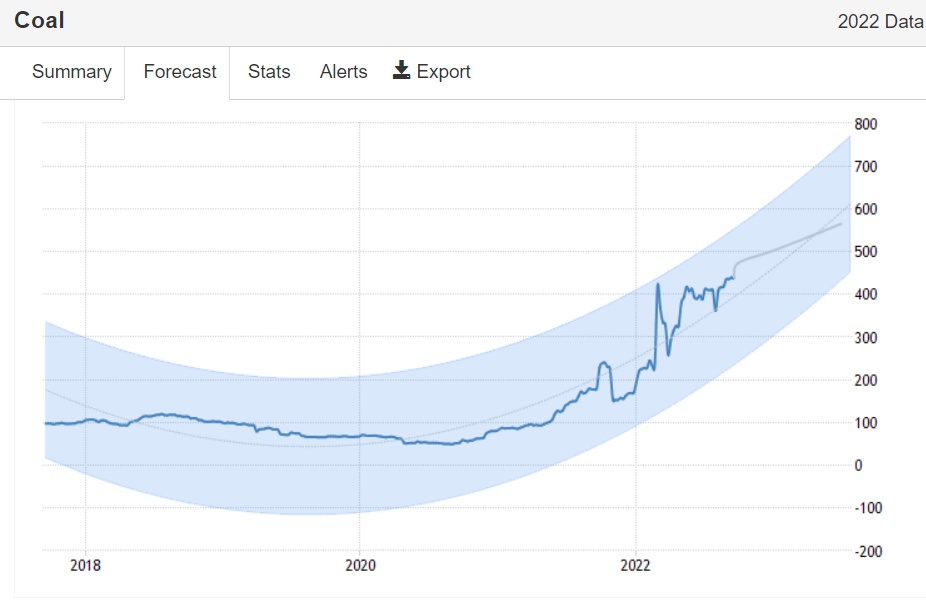 数据显示,9月16日,澳大利亚纽卡斯尔港近月期实物动力煤期货(全球动力煤价格基准)的交易价格为每吨429美元,虽然低于3月份483.50美元的历史高点,但远高于去年同期的176美元左右。数据统计平台TradingEconomics公布的预测数据显示,未来一段时间,纽卡斯尔动力煤期货价格有望继续上行。
