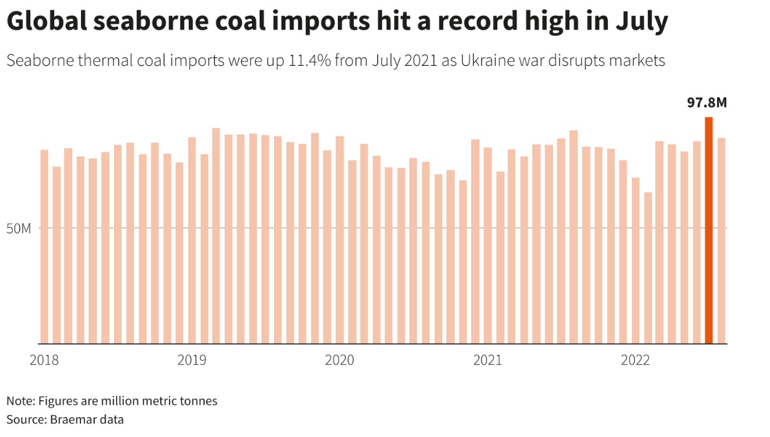 然而,欧洲愈发严峻能源危机改变了这一切。受俄乌冲突以及西方国家对俄制裁措施带来的影响,用于发电的动力煤基准价格飙升至创纪录水平,与此同时,在对俄能源禁令之下,欧洲国家无法从其最大能源供应国俄罗斯获取至关重要的天然气和煤炭供应。