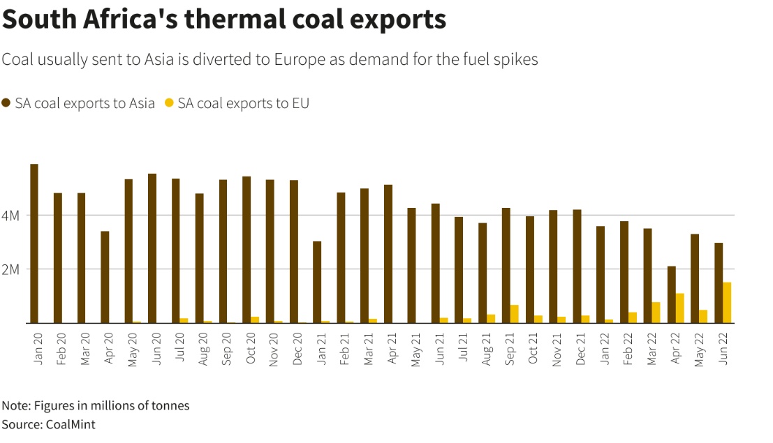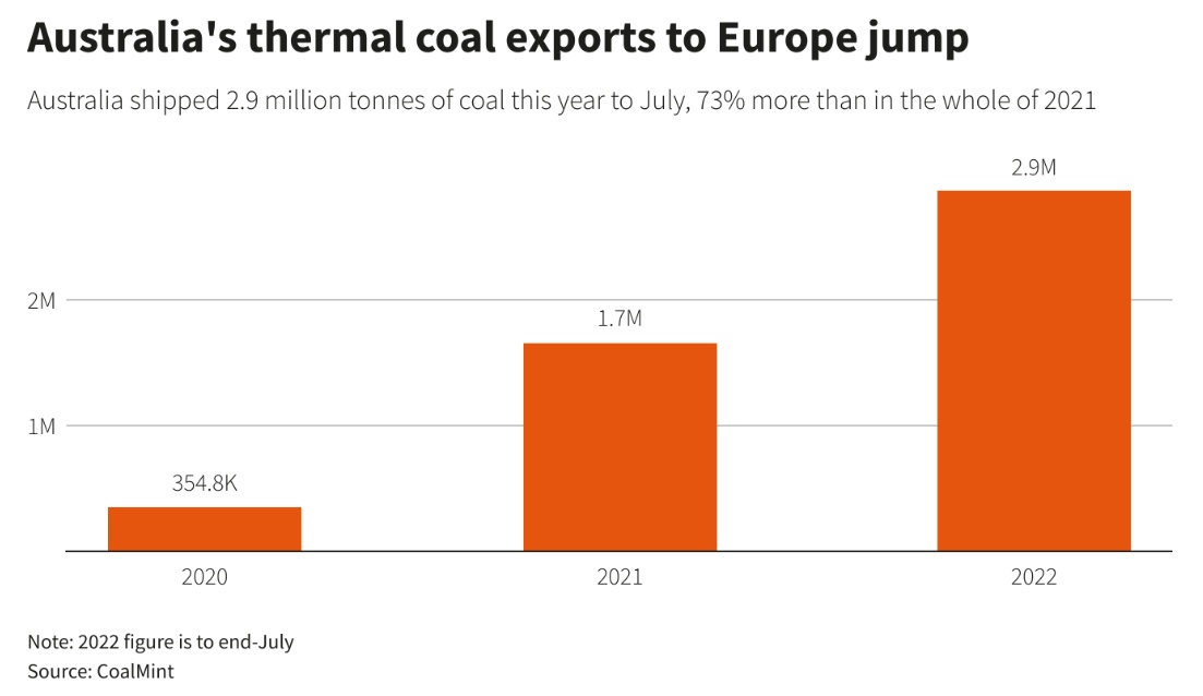 印度咨询公司Coalmint的统计数据显示,在俄乌冲突后的4个月内,欧盟从澳大利亚、南非和印尼的动力煤进口量增长了逾11倍。如下图所示南非和澳大利亚出口至欧洲的动力煤数量激增。历史数据显示,这些国家一般来说是亚洲市场的重要供煤国。