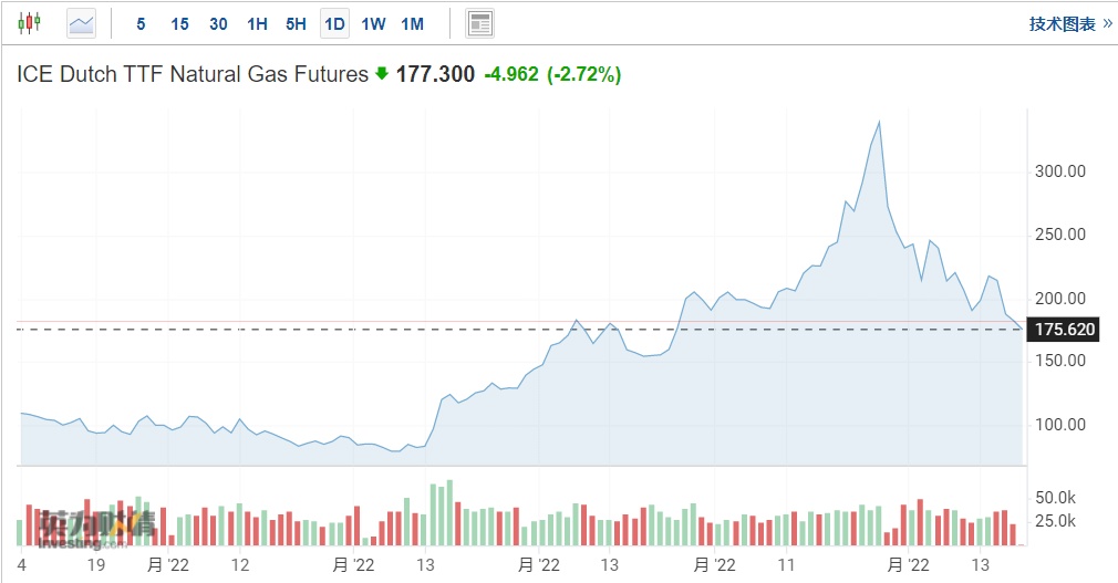 数据显示,欧洲基准荷兰近月天然气交易价格连续第四个交易日下跌,跌幅一度高达6.8%,为去年7月以来的最长下跌时间。截至发稿,该期货跌2.72%,报177.3欧元/兆瓦时。