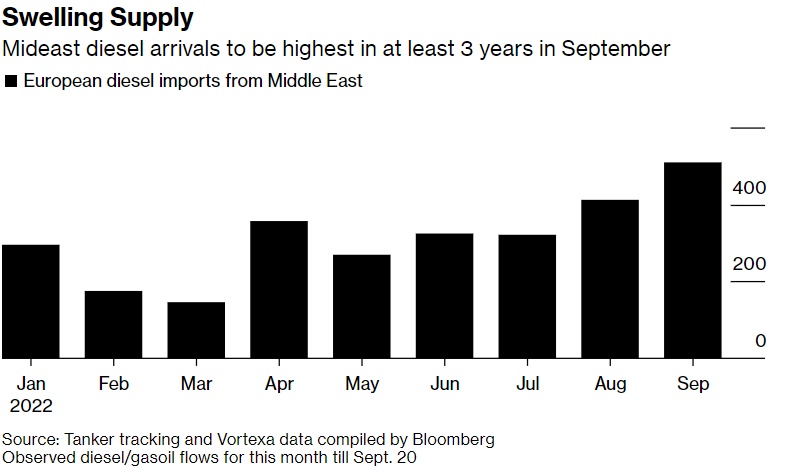 根据彭博社汇编的油轮跟踪数据和Vortexa统计数据,9月份从中东地区进入欧洲大陆的柴油供应量为每天约为50.9万桶,至少是2019年初以来的最高水平。