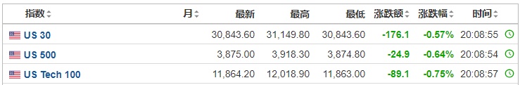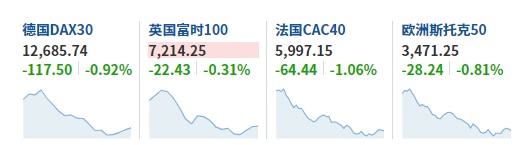 2. 截至发稿,德国DAX指数跌0.92%,英国富时100指数跌0.31%,法国CAC40指数跌1.06%,欧洲斯托克50指数跌0.81%。
