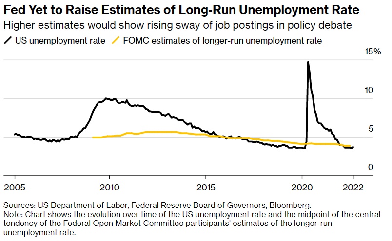 美联储仍未上调长期失业率预测值——更高预测水平将表明,职位空缺在政策辩论中的影响力越来越大