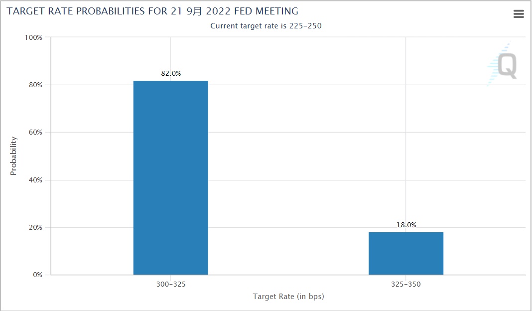 芝商所FedWatch工具显示,当前市场预计,美联储9月加息75个基点的概率高达82%(此前一度高达90%),加息100个基点的概率为18%——CPI数据公布前市场还未将此加息幅度纳入定价区间。紧缩周期的下一阶段面临的风险可能更大,这可能会反映在他们修订后的预测数据之中。