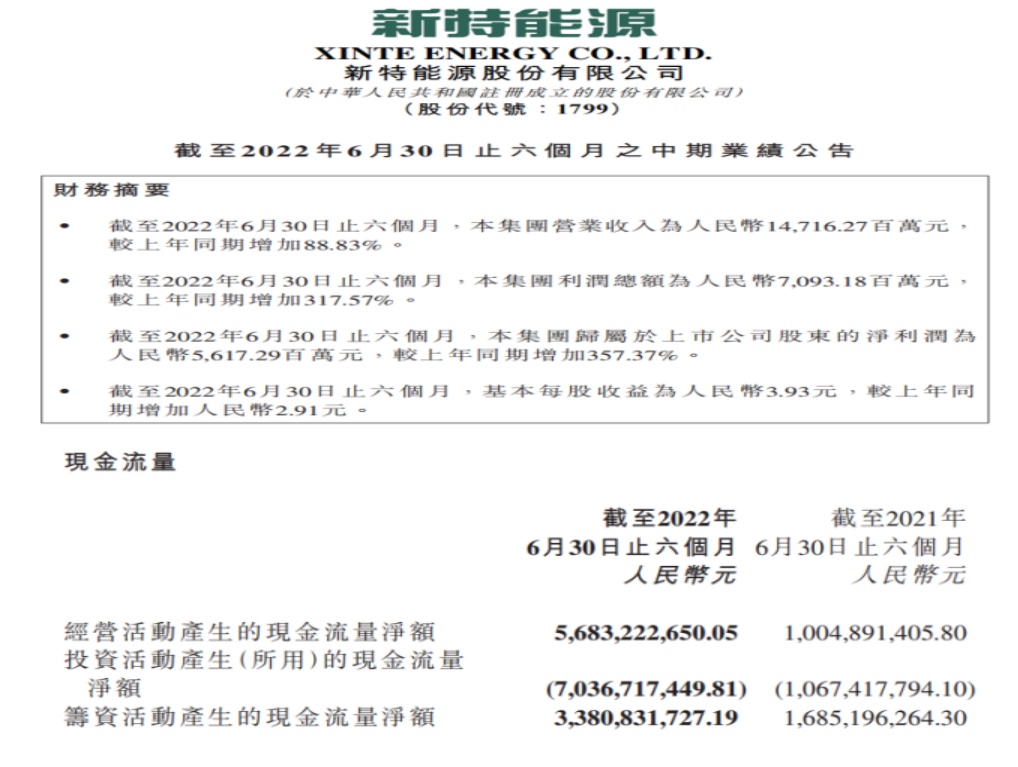 据新特能源近期发布的2022年中期业绩公告,公司期间内取得收入约147.16亿元(人民币,下同),同比增加88.83%;综合毛利率达到57.14%,同比提升25.3个百分点;股东应占溢利约56.17亿元,同比增加357.37%;经营活动产生的现金流量净额达到56.83亿元,同比增长465.6%。