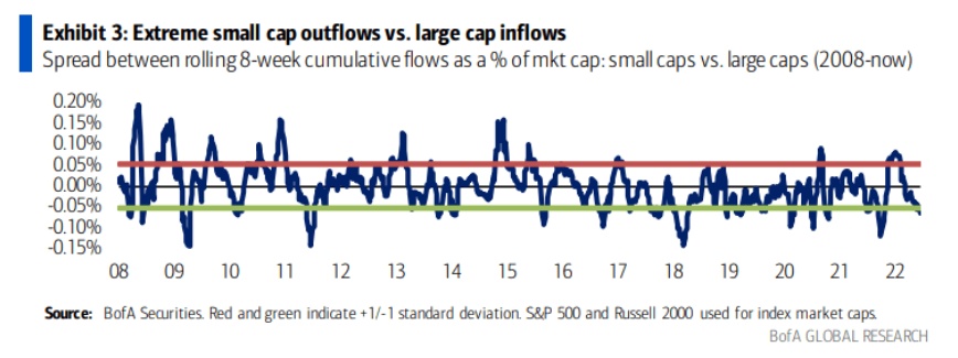 智通财经APP获悉,根据最新的每周调查显示,美国银行的客户仍在将现金投入大盘股,并撤出小盘股。但该行股票团队表示,这一趋势更有利于市值较小的股票。