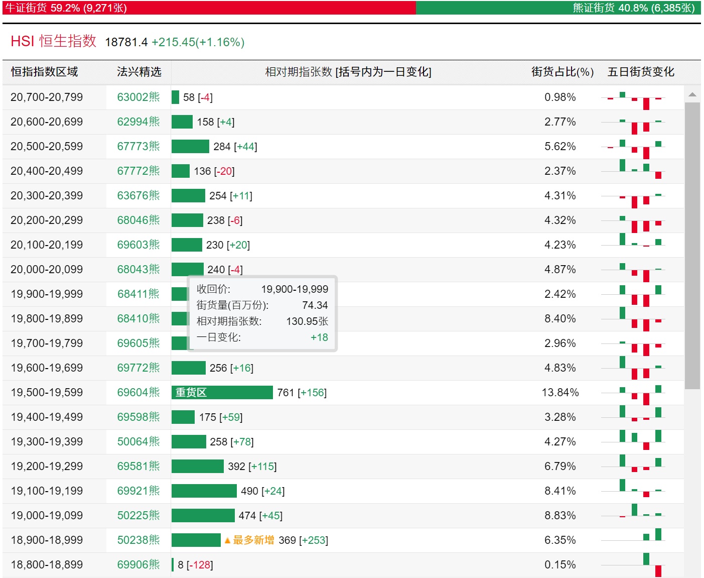 法兴恒指牛熊证街货分布图中的数据显示,熊证街货重货区在19500-19599区间,该区间最新熊证数量为761张,较上一交易日增加156张;最多新增在18900-18999区间,该区间最新熊证数量为369张,较上一交易日增加253张。