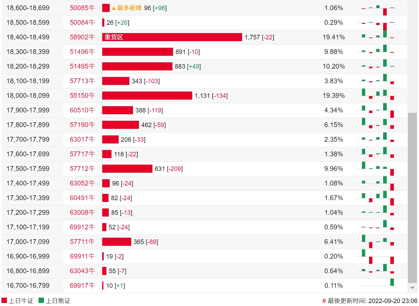 牛证街货重货区在18400-18499区间,该区间最新牛证数量为1757张,较上一交易日减少22张;最多新增在18600-18699区间,该区间最新牛证数量为96张,较上一交易日增加96张。