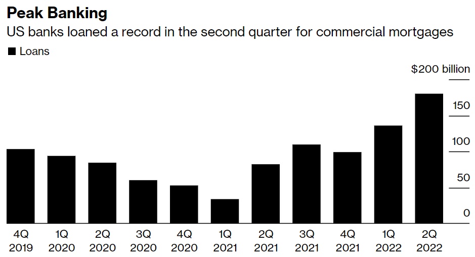 根据美联储的数据,在截至6月份的六个月里,美国受监管的银行提供了创纪录的3160亿美元新商业房地产贷款,比2021年同期增长172%。贷款激增之际,美联储上调了利率以冷却通胀,这一举措使商业地产的借贷成本在过去一年翻了一番。市场预计美联储将在周四的会议上进一步加息,外界猜测官员们可能会将基准利率提高75个基点或更多。
