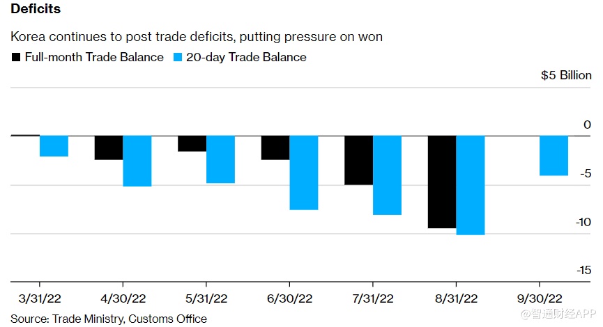 韩国9月前20天的贸易逆差达41亿美元。虽然这是8月创纪录的95亿美元的一半,但韩国财政部长秋庆镐(Choo Kyung-ho)表示,随着芯片需求降温和经济放缓,以及能源价格剧烈波动,出口面临的风险依然存在。
