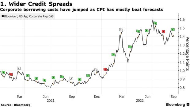 上周公布的美国8月消费者价格指数(CPI)强于预期,巩固了投资者们对美联储将于本周连续第三次加息75个基点的押注。除了通胀放缓之外,其他可能导致美联储收敛其强硬态度的潜在指标还包括信贷息差扩大、违约风险上升、债券市场流动性萎缩以及汇市动荡加剧。本文通过以下四张图表对这些潜在指标进行更深入的分析。