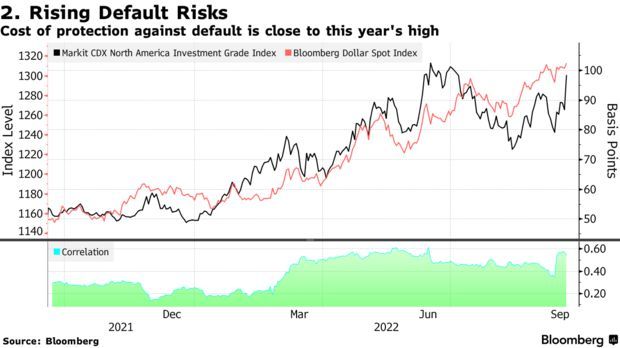 针对公司债务违约风险的保护成本激增同样可能会吓到美联储。Markit CDX北美投资级指数(Markit CDX North America Investment Grade Index)是一篮子投资级债券信用违约掉期的基准,今年以来该指数的价差已经翻了一番,达到约98个基点,接近6月份创下的2022年102个基点的高点。违约风险的增加与美元升值密切相关,而美元升值得益于美联储加速加息的步伐。