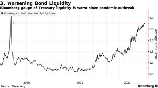 另一个可能促使美联储放慢紧缩步伐的威胁是国债流动性的萎缩。彭博的美国主权流动性指数接近自2020年初新冠疫情爆发以来的最糟糕水平。摩根大通测算的美国十年期国债的市场深度也降至2020年3月的水平,当时交易员们甚至都难以为流动性最强的政府债券找到价格。