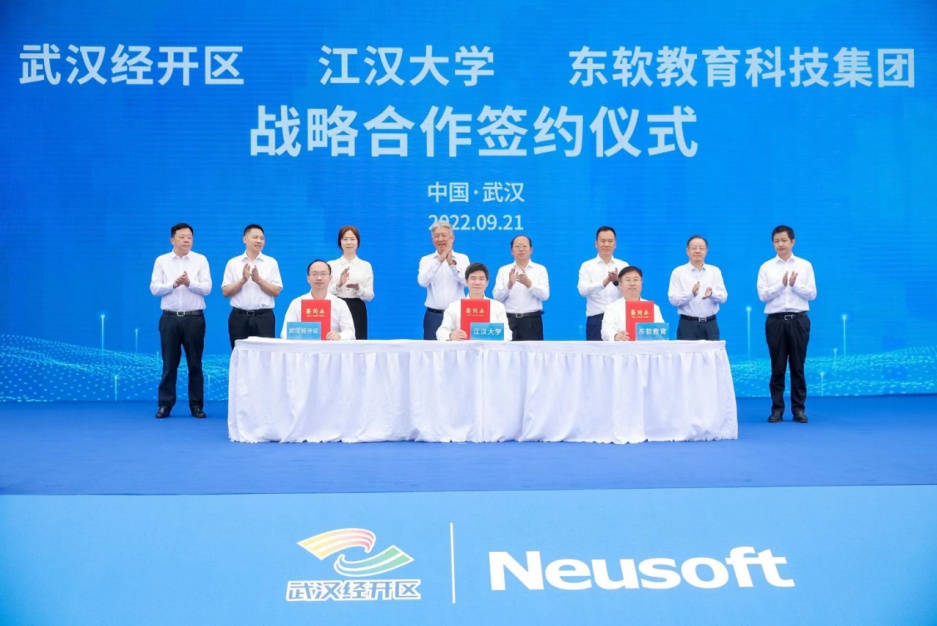 东软教育科技集团高级副总裁李印杲、江汉大学副校长李卫东、武汉经开区副主任吕鹏共同签署了三方战略合作协议。