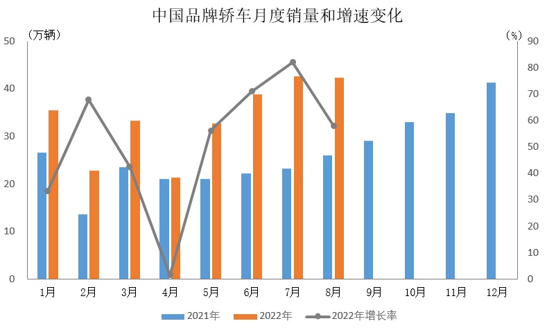 2022年1-8月,中国品牌乘用车共销售699.8万辆,同比增长24.5%,占乘用车销售总量的47.8%,占有率比上年同期提升4.9个百分点。