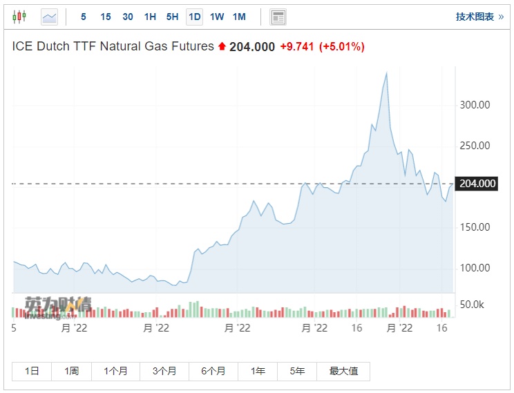 智通财经APP获悉,周三,俄罗斯总统普京签署了部分动员令。尽管欧洲各国加大了防止能源危机扩大的努力,但在交易员们对冬季供应的安全性进行了评估后,欧洲天然气价格飙升。周二,欧洲基准荷兰TTF天然气期货收涨超9%,截至发稿,欧洲天然气期货价格续涨超5%,报204欧元/兆瓦时。