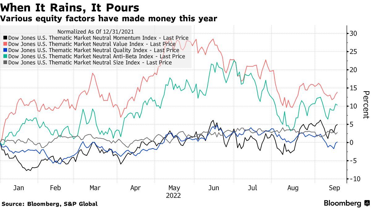 道琼斯市场中性指数显示,五种最受欢迎的因子类型——价值、动量、质量、规模和低波动性因子——都在2022年实现收益。AQR股票市场中性基金今年以来上涨了15%,这是一种采用多种因子的多空性质产品。