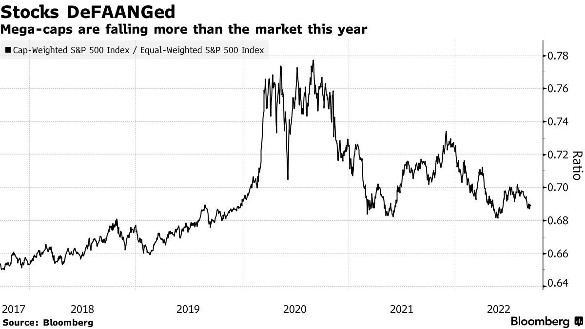 今年以来,Meta Platforms(META.US)和Alphabet(GOOGL.US)等大型科技股在利率刺激下不断面临抛售潮,利率上升正不断冲击一些较昂贵的股票。今年以来,通常来说备受投资者青睐的大型权重股跌幅超过了美股大盘,与一些同等较低权重的标普500成分股相比,标准市值加权的标普500指数成分股,即权重较大的标的,今年有可能是自2013年以来表现最差的一年。