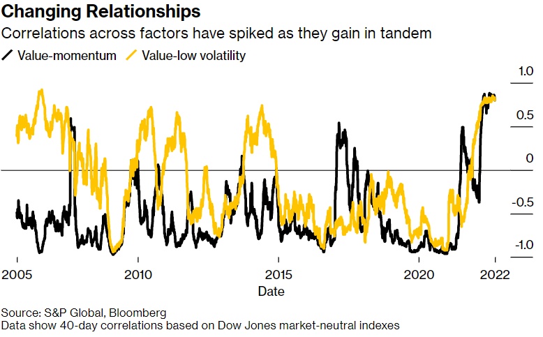 与此同时,购买波动性最小股票的策略也在卷土重来,成为美股抛售风暴的避险工具之一,聚焦该项交易的市场中性指数有望创下2018年以来的最佳表现。这意味着价值与低波动率的相关性也将达到2006年以来的最高水平。