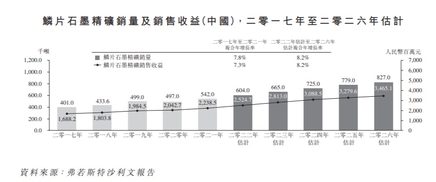 根据弗若斯特沙利文报告显示,2016-2020年间,中国球形石墨销量复合年增长率达到21.7%,销售收益复合年增长率为16.8%;鳞片石墨精矿销量复合年增长率则预计于2021-2025年间达到7.3%,销售收益复合年增长率有望达到7.8%。