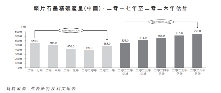 据弗若斯特沙利文报告披露,预计至2026年,国内鳞片石墨精矿的销量将增加至约8270千吨,自2022年起计的复合年增长率约为8.2%;国内球形石墨销量增至2370千吨,2022年至2026年的复合年增长率约为12.1%。