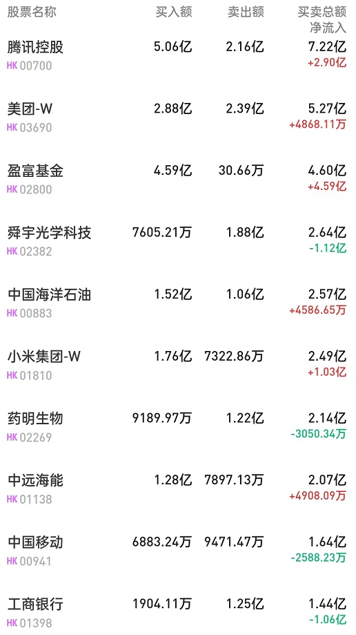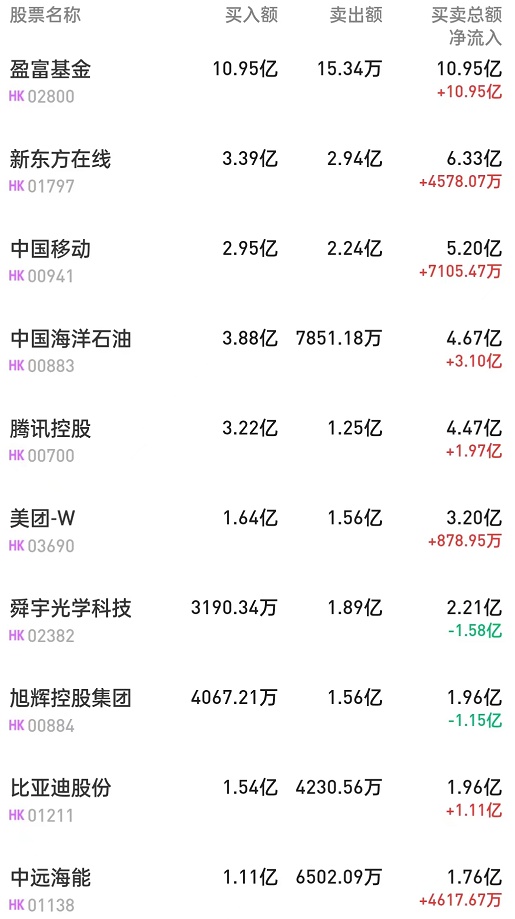 此外,盈富基金(02800)、小米集团-W(01810)、中国移动(00941)分别获净买入15.53亿、1.02亿、4517万港元。而工商银行(01398)遭净卖出1.05亿港元。