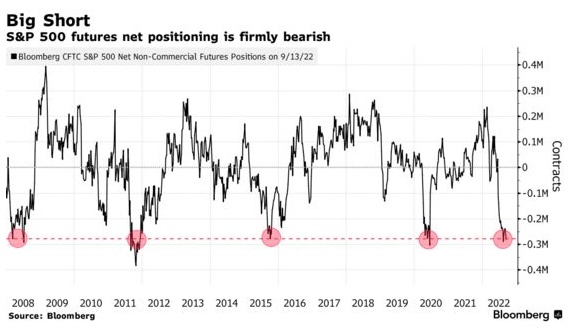 另一个指标CFTC的标准普尔500净非商业性期货,也显示出极为负面的看法,已达到2008年、2011年、2015年和2020年衰退期间的水平。这种悲观情绪通常被视为一个反向指标,预示着反弹。
