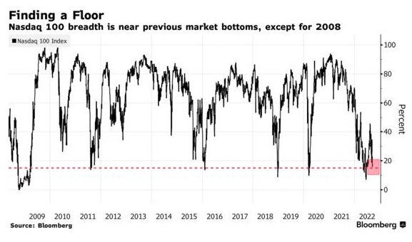 市场技术面也可能预示着底部即将到来,尤其是在科技股方面。以科技股为主的纳斯达克 100 指数今年下跌了 27%,目前约有 16% 的成分股交易价格略高于 200 天移动平均线。
