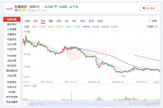 在今年股价跌跌不休中,和黄医药多次发布利好消息,如公司将在2022年ESMO年会上公布呋喹替尼(Fruquintinib)治疗难治性的转移性结直肠癌的FRESCO-2国际多中心III期研究数据总结;向3名雇员授出其认股权计划项下的认股权。然而公司的股价并未因此利好的消息上涨,反而在这些公告后继续下跌,截至9月21日收盘,公司股价跌4.71%,收16.2港元/股。