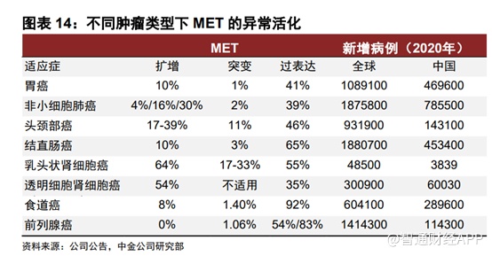 MET靶点是一个泛靶点,大多数的肿瘤类型中都可能会出现MET基因突变,例如消化道癌、肺癌、肝癌、脑癌等。MET的异常活化虽然在单一瘤种中发生率较低,但由于其跨瘤种的特点,使得c-MET抑制剂赛沃替尼的目标患者人群进一步扩大。
