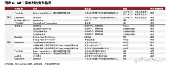 目前全球上市的MET抑制剂除赛沃替尼之外,另有诺华的卡马替尼和默克的特泊替尼分别于2020年先后在美国和日本获批上市,其中特泊替尼也于2021年2月获FDA批准在美国上市。特泊替尼和卡马替尼目前均在中国进行临床II期研究,其他正在全球及中国开发的MET抑制剂目前尚处于临床早期阶段,赛沃替尼在中国市场的进度远快于竞争对手。