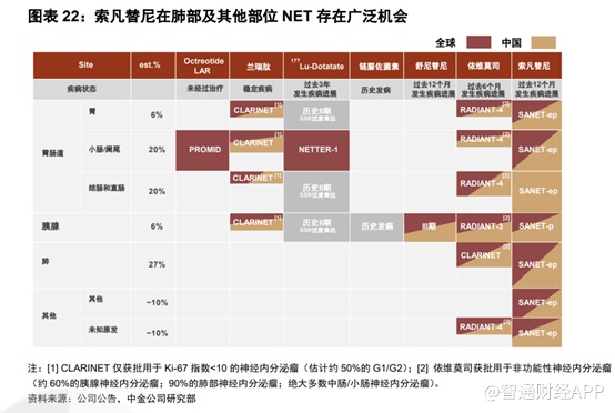 神经内分泌肿瘤起源于遍布全身的弥漫性神经内分泌细胞,主要分布在胃肠道、胰腺中的胰岛和支气管肺系统。根据病灶来源将神经内分泌瘤分类,其中胰腺NET占比约6%,胃肠NET占比约47%,肺部NET占比约27%,其他部位占比约20%。生长抑素类似物常用作G1/2期患者的一线治疗药物,疾病进一步进展后的治疗选择包括以舒尼替尼和依维莫司为代表的抗血管生成的靶向药物和传统的化疗药物。依维莫司仅获批用于治疗G1/2晚期非功能性神经内分泌瘤,舒尼替尼仅获批用于治疗G1/2晚期胰腺神经内分泌肿瘤。索凡替尼可治疗不分病灶来源的所有G1/2级晚期神经内分瘤患者,是在肺部及其他部位也可使用的靶向药物。