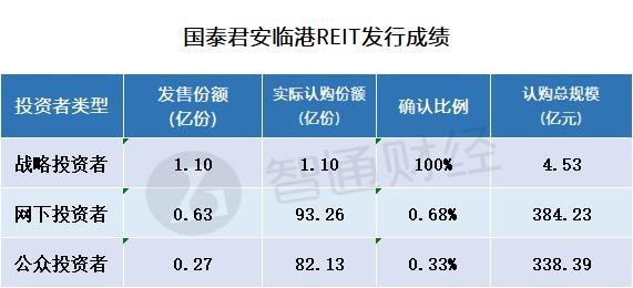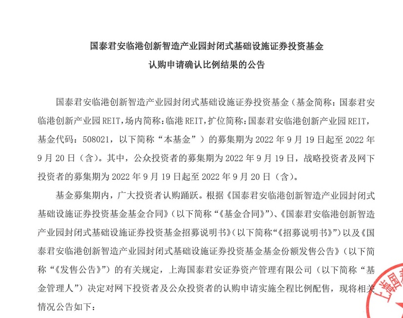 智通财经APP获悉,9月21日晚间,上交所发布公告国泰君安临港创新产业园REIT(临港REIT)的认购申请确认比例结果出炉。参照该只基金4.12元/份的认购价格(下同),临港REIT战略投资者、网下投资者和公众投资者比例配售前认购总金额达727.16亿元。又因该只基金设置了2亿份的募集规模上限,预计发行规模最终为8.24亿元(不含认购费用和认购资金在募集期利息)。