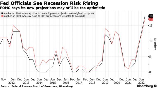 此外,美联储发布的《经济预测摘要》中显示,到2023年,失业率预计将从目前的3.7%升至4.4%。此外,美联储预计2022年GDP增长0.2%,远低于6月预期增速1.7%;对2023年GDP的预测下调至1.2%,对2024年的预测降至1.7%。