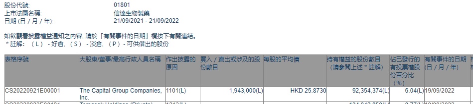 智通财经APP获悉,香港联交所最新资料显示,9月19日,The Capital Group Companies Inc.增持信达生物(01801)194.3万股,每股作价25.8730港元,总金额约为5027.12万港元。增持后最新持股数目约为9235.44万股,最新持股比例为6.04%。