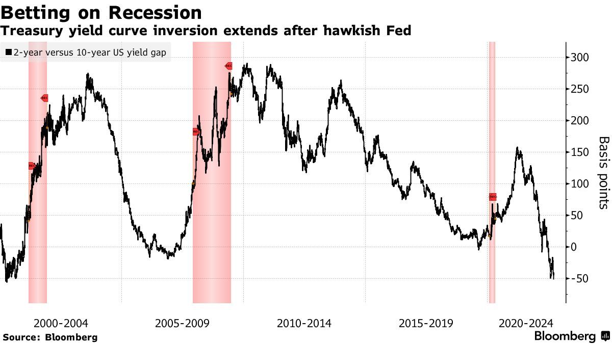 鲍威尔发表的鹰派言论明显刺激了美国国债交易员,进一步加剧了已经处于几十年从未见水平的收益率曲线倒挂幅度。