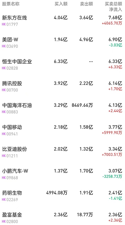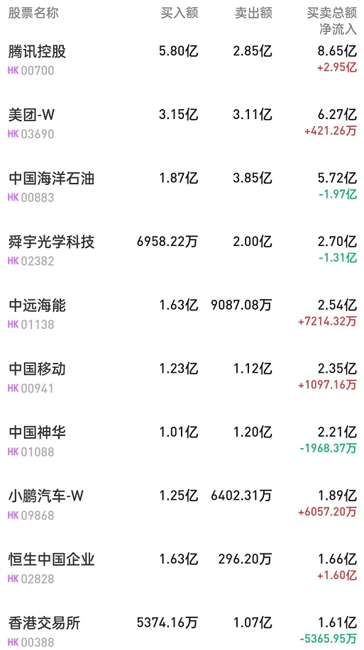 中海油(00883)获净买入4669万港元。消息面上,中国海洋石油公布,9月21日耗资约966.66万港元回购96.5万股股份。小摩此前发布研报称,预计中海油在未来三个月将持续购回H股,主因预测现价仅反映油价65美元/桶水平。该行维持中国海洋石油“增持”评级,目标价15港元。