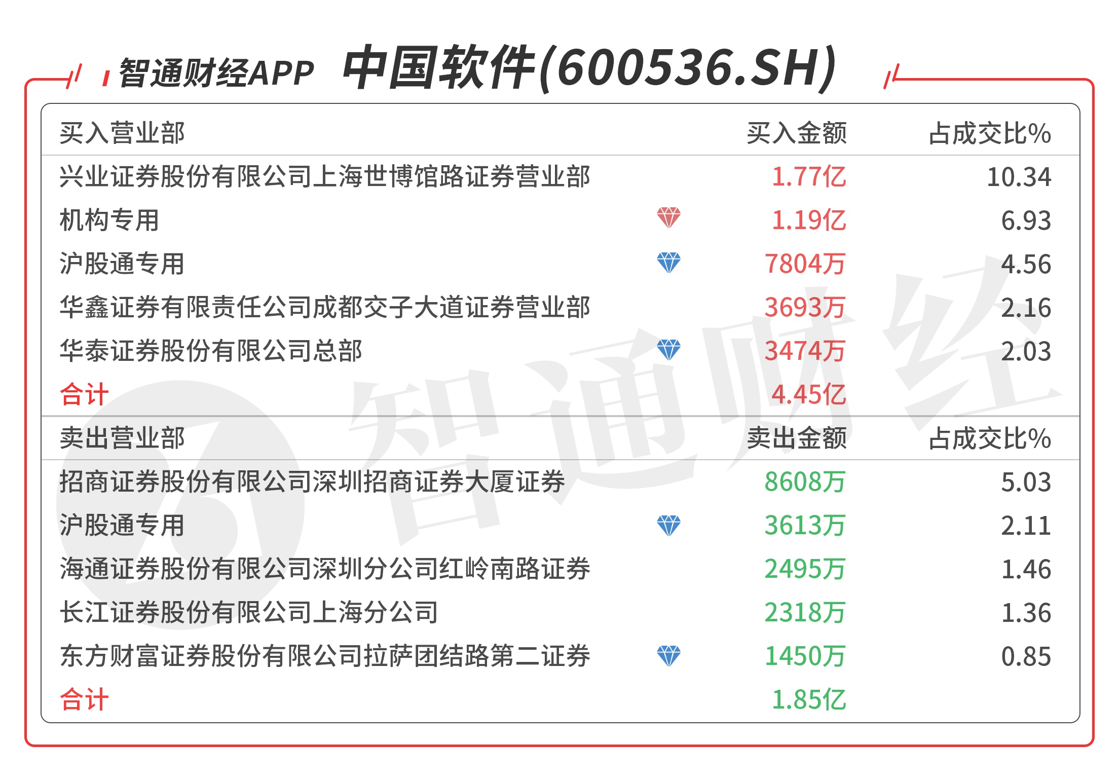 中国软件(600536.SH):龙虎榜阵容豪华,机构席位买入1.19亿元,沪股通对倒净买入4191万元,买五是量化基金的席位买入3474万元,当日净买入2.6亿元,该股如突破前期高点,则有望打开上升空间。