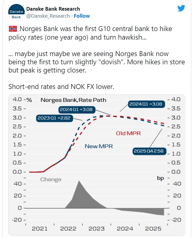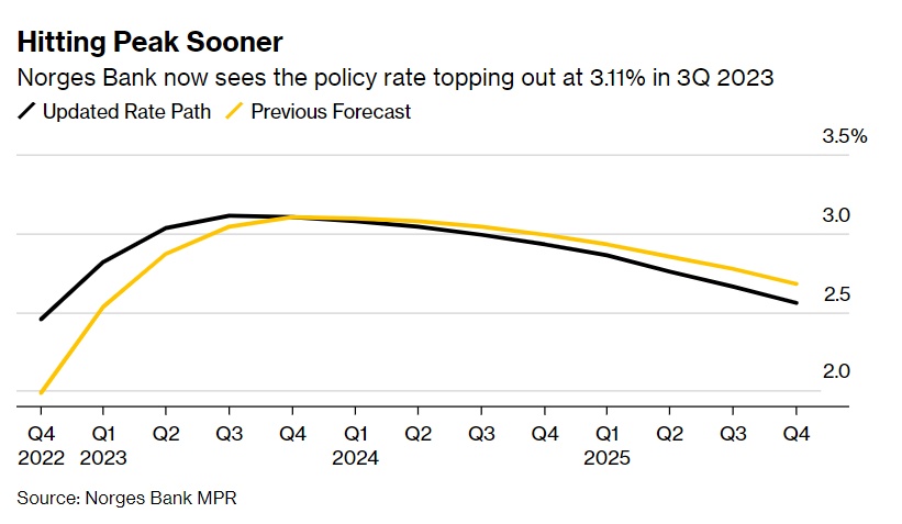 挪威央行目前预计,2023年第三季度政策利率将达到3.11%的峰值