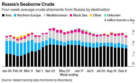 按目的地分列的俄罗斯过去 4 周平均原油出货量