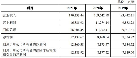 财务方面,于2019年度、2020年度及2021年度,公司实现营业收入分别约为9.34亿元、10.96亿元及17.02亿元,同期,公司归属于母公司股东的净利润分别约为7334.72万元、8173.47万元、1.24亿元。