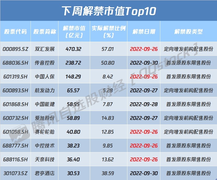 从解禁比例来看,下周双汇发展解禁比例达57.01%,其次解禁比例居前的分别为传音控股和壹网壹创;从解禁市值来看,双汇发展、传音控股、中国人保等股解禁市值居前。