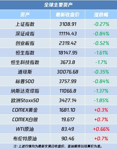 5、欧股市场:德国DAX30指数跌1.86%,英国富时100指数跌1.16%,法国CAC40指数跌1.87%,欧洲斯托克50指数跌1.79%。