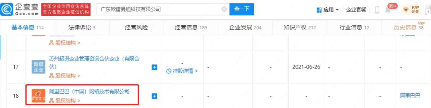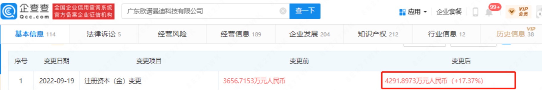 智通财经APP获悉,企查查APP显示,广东欧谱曼迪科技有限公司(下称:欧谱曼迪)近日发生工商变更,新增阿里巴巴(中国)网络技术有限公司等多名股东。同时,公司注册资本由3656.72万元人民币增加至4291.9万元人民币。