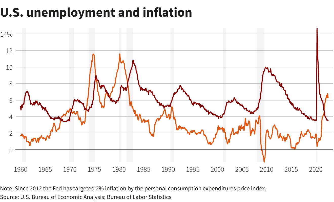 在最近的三次经济衰退中,失业率分别在2020年、2009年和2001年达到约14.7%、9.5%和5.5%的峰值。不过,这些经济衰退发生之前,通胀都没有接近过如今的水平。这一事实可能会让即将到来的衰退更加痛苦。