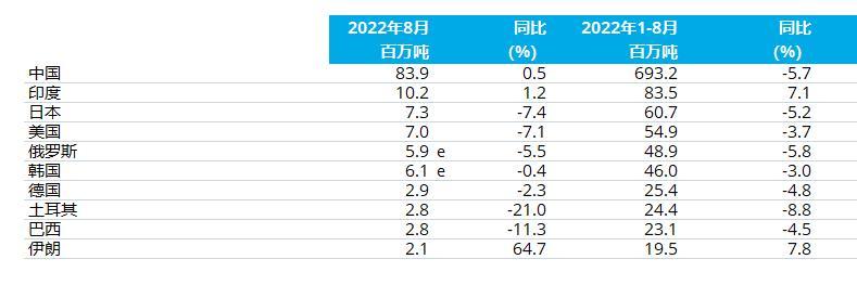 中国粗钢产量为8390万吨,同比提高0.5%;